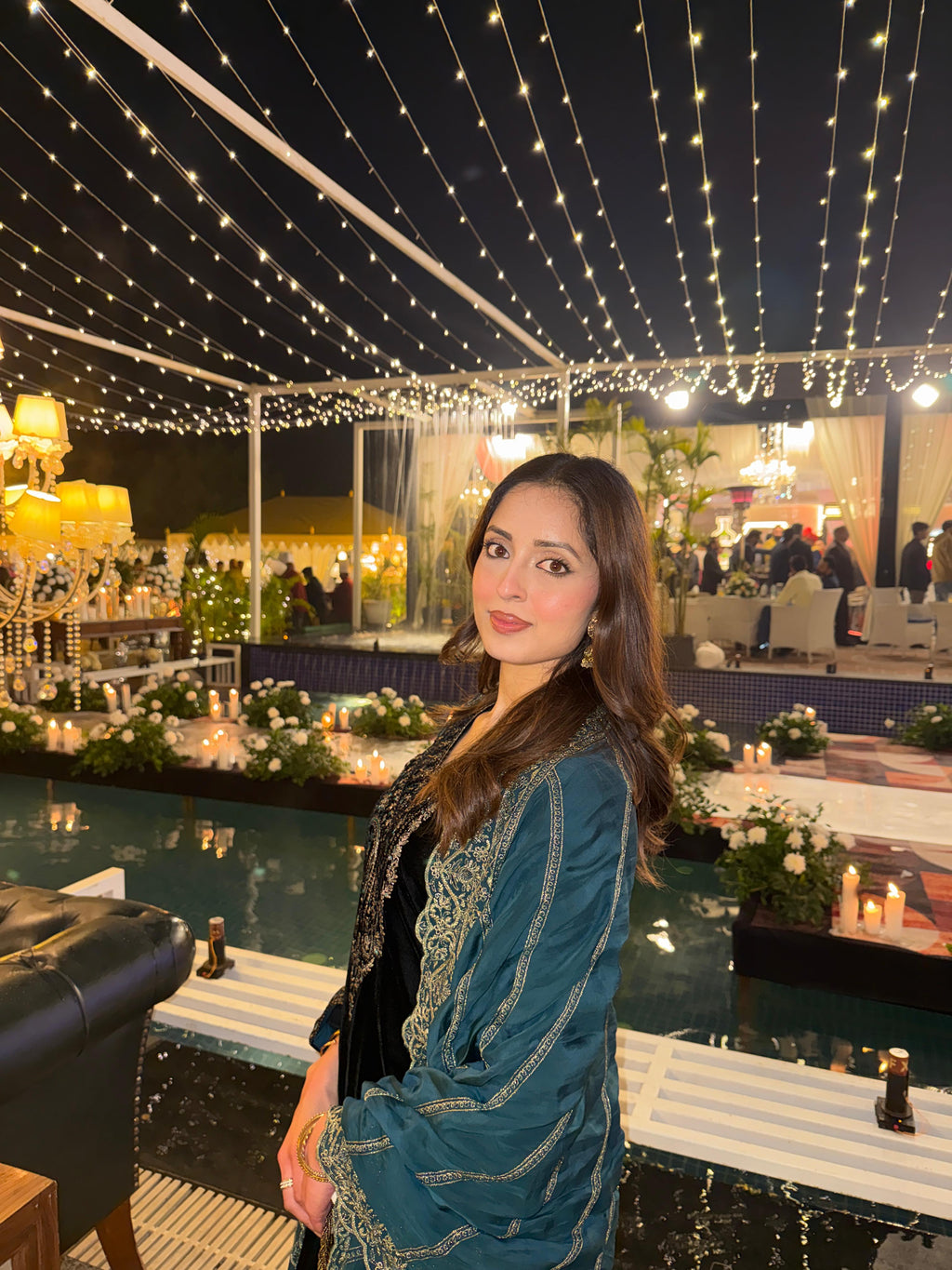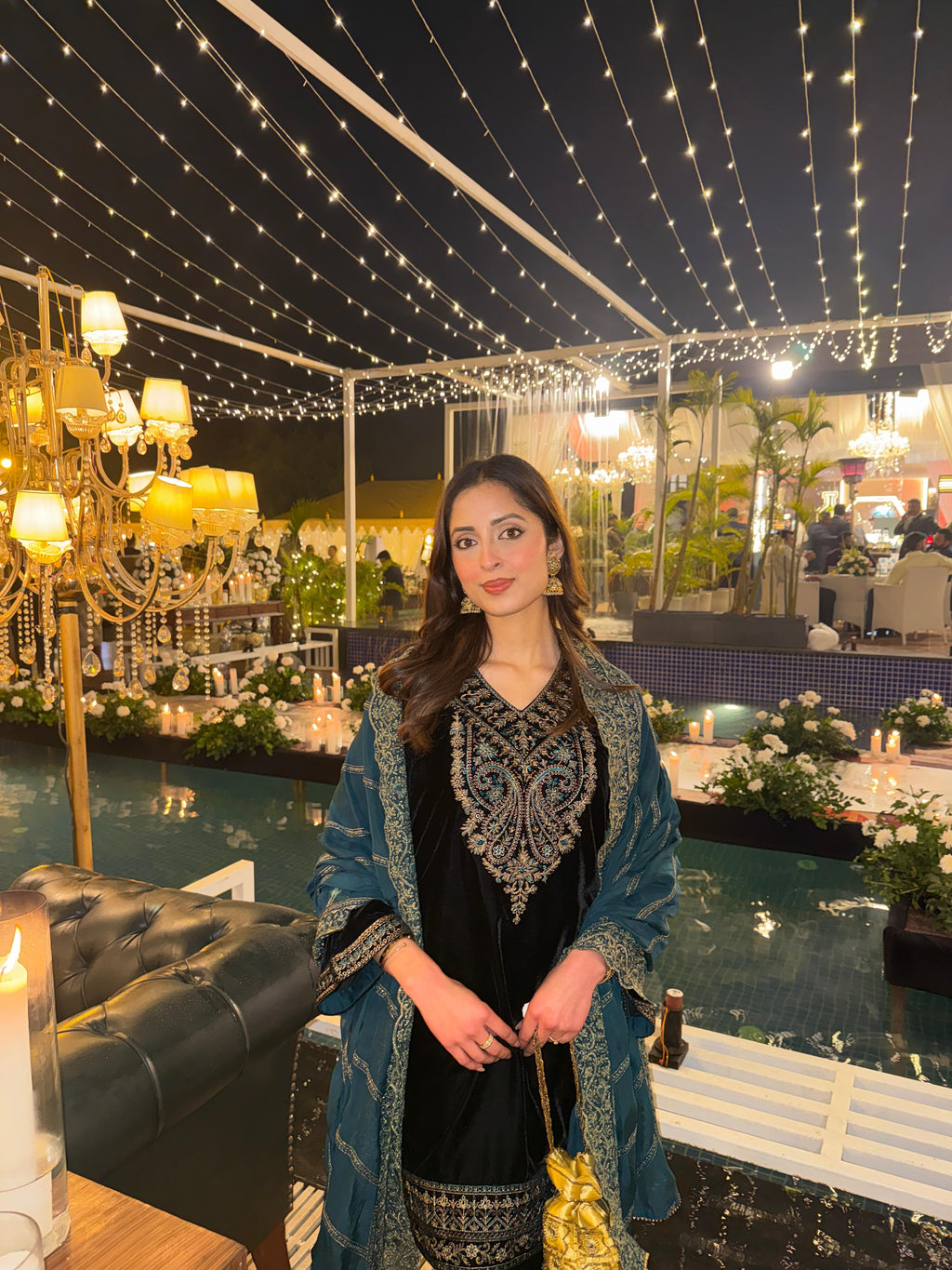 Make a grand entrance in the Aafreen Black Velvet Embroidered Suit, a masterpiece that combines luxurious velvet with exquisite embroidery. This velvet suit set features a rich teal blue dupatta, creating a striking look that’s ideal for weddings, festivals, and elegant gatherings. The intricate embroidery enhances the sophistication of the ensemble, while the matching dupatta adds a graceful touch to complete the outfit.