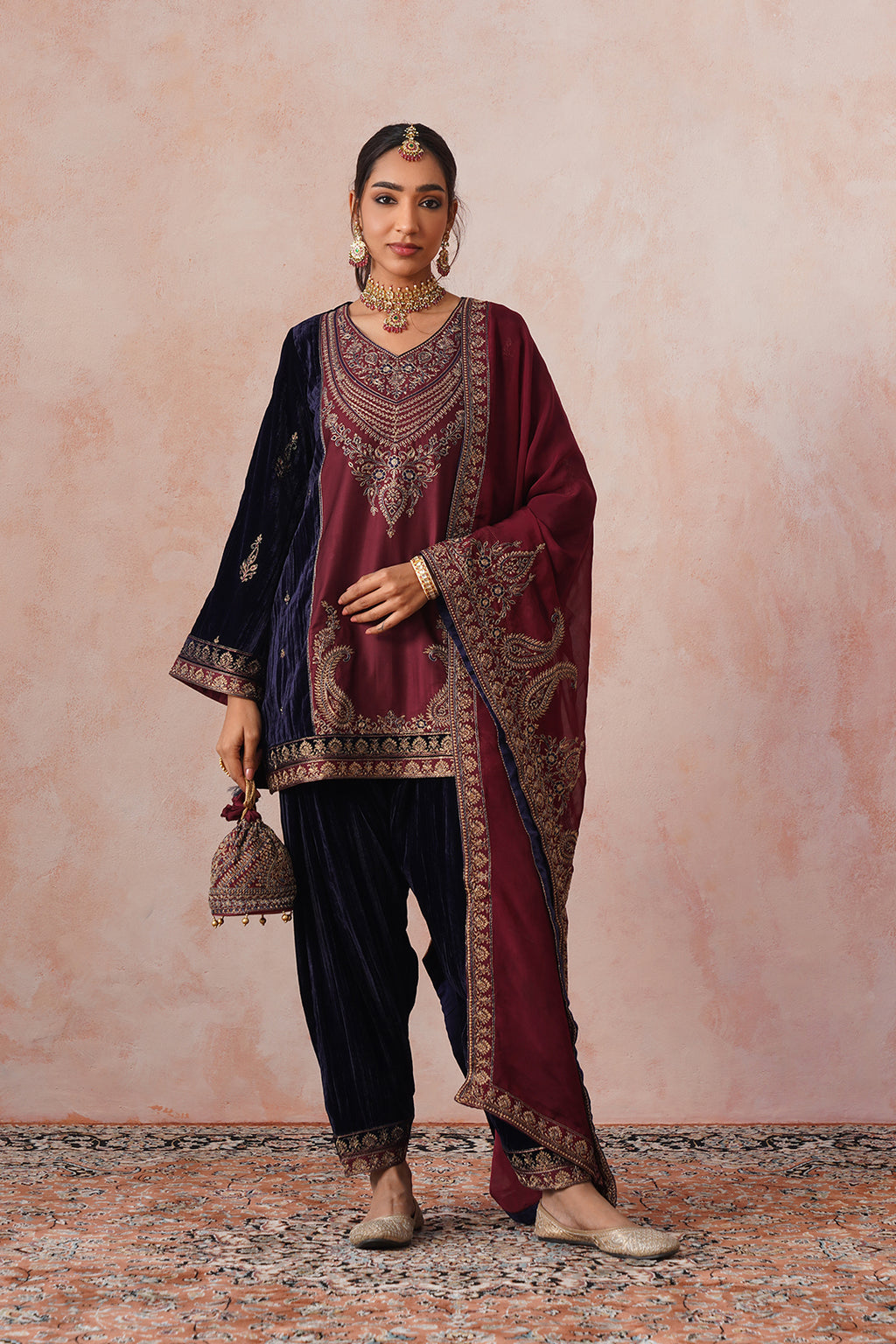 Make a regal statement with this Navy–Maroon Panel Velvet Embroidered Set, designed in rich jewel tones that exude timeless elegance. The crushed velvet fabric with maroon modal panel adds a luxurious depth, while the intricate embroidery offers detailed craftsmanship that feels refined and opulent without being overwhelming.