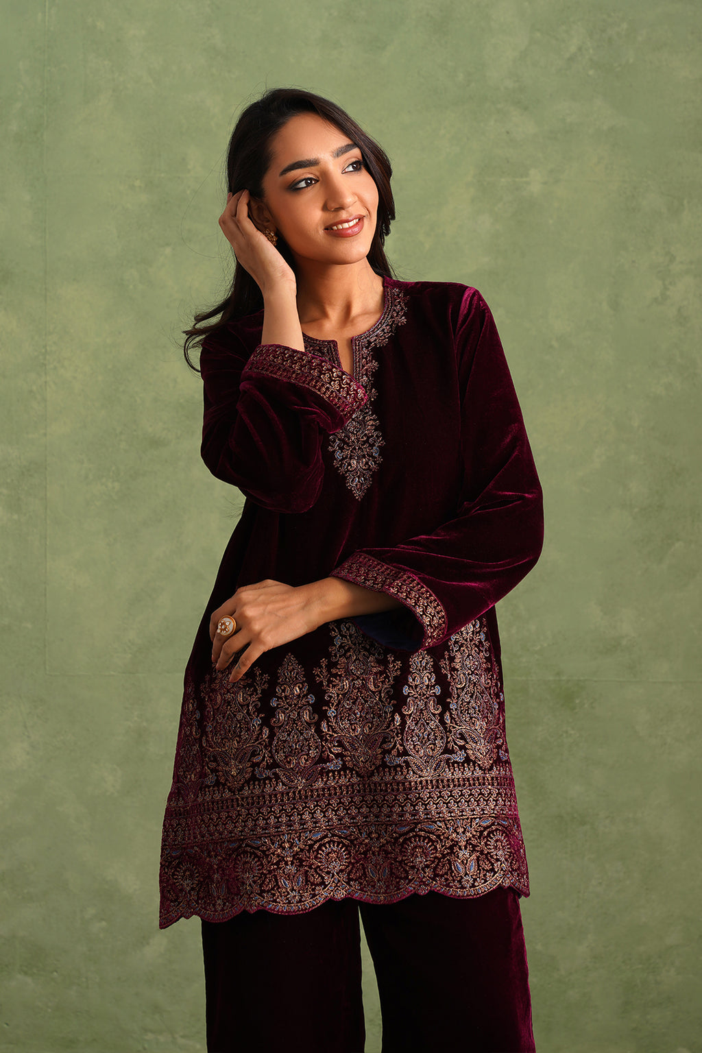 Paired with a wide pant and a richly adorned dupatta, this ensemble is perfect for weddings, festivals, and special occasions. Whether you’re drawn to timeless style or a bold statement look, the Wine Velvet Embroidered Kurta Set brings refined glamour to your festive wardrobe.