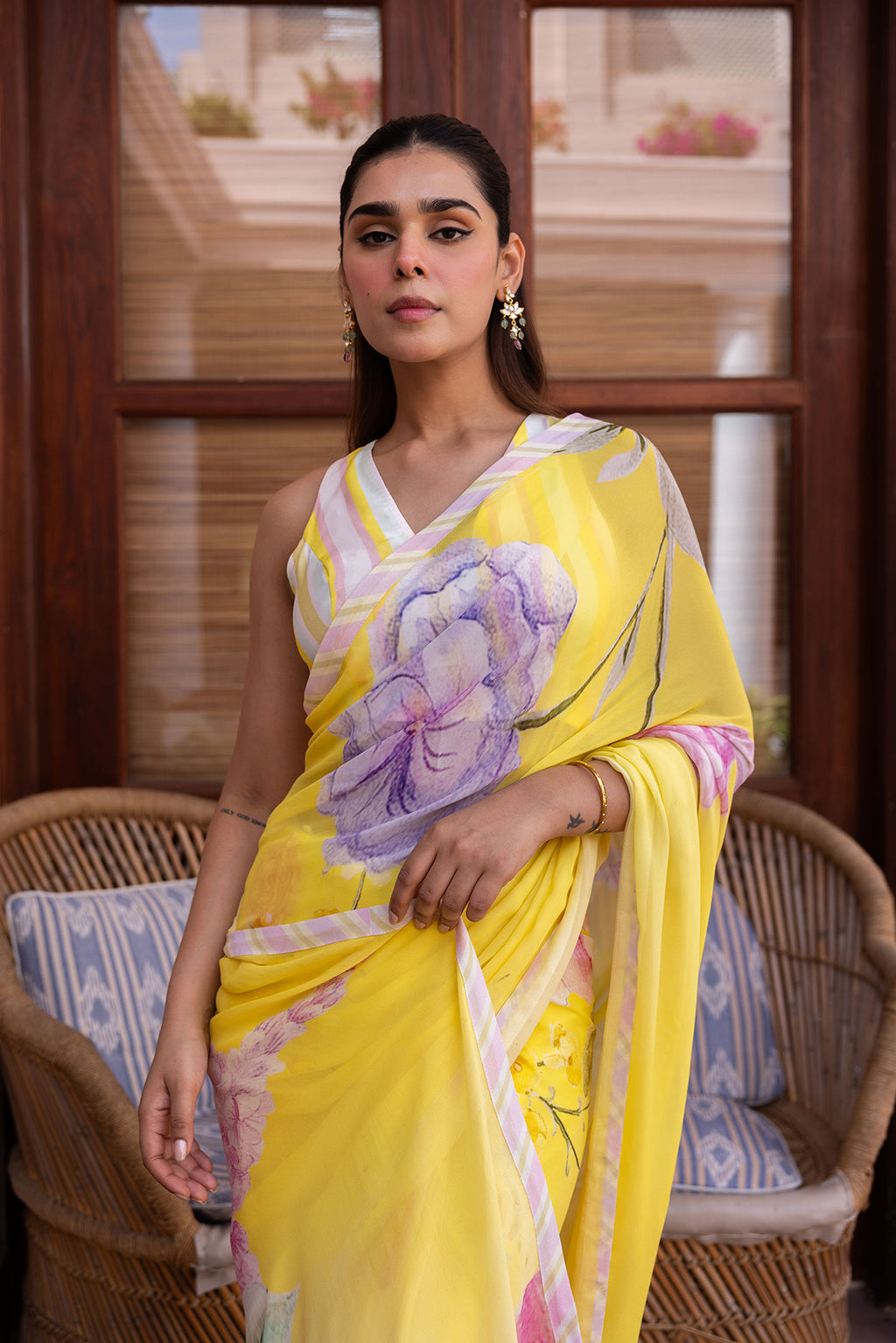 The radiant yellow base is adorned with printed oversized, hand-painted floral motifs in shades of romantic lavender and soft pink, creating a whimsical "watercolor bloom" effect. Its breathable and airy texture makes it the impeccably polished choice for a traditional Anand Karaj or a vibrant Haldi ceremony. Whether you are a bride-to-be looking for a modern Mehendi outfit or a guest at a Summer Garden Party, this saree ensures you look perfectly composed while navigating a busy Wedding Carnival or a grand Festive Celebration.