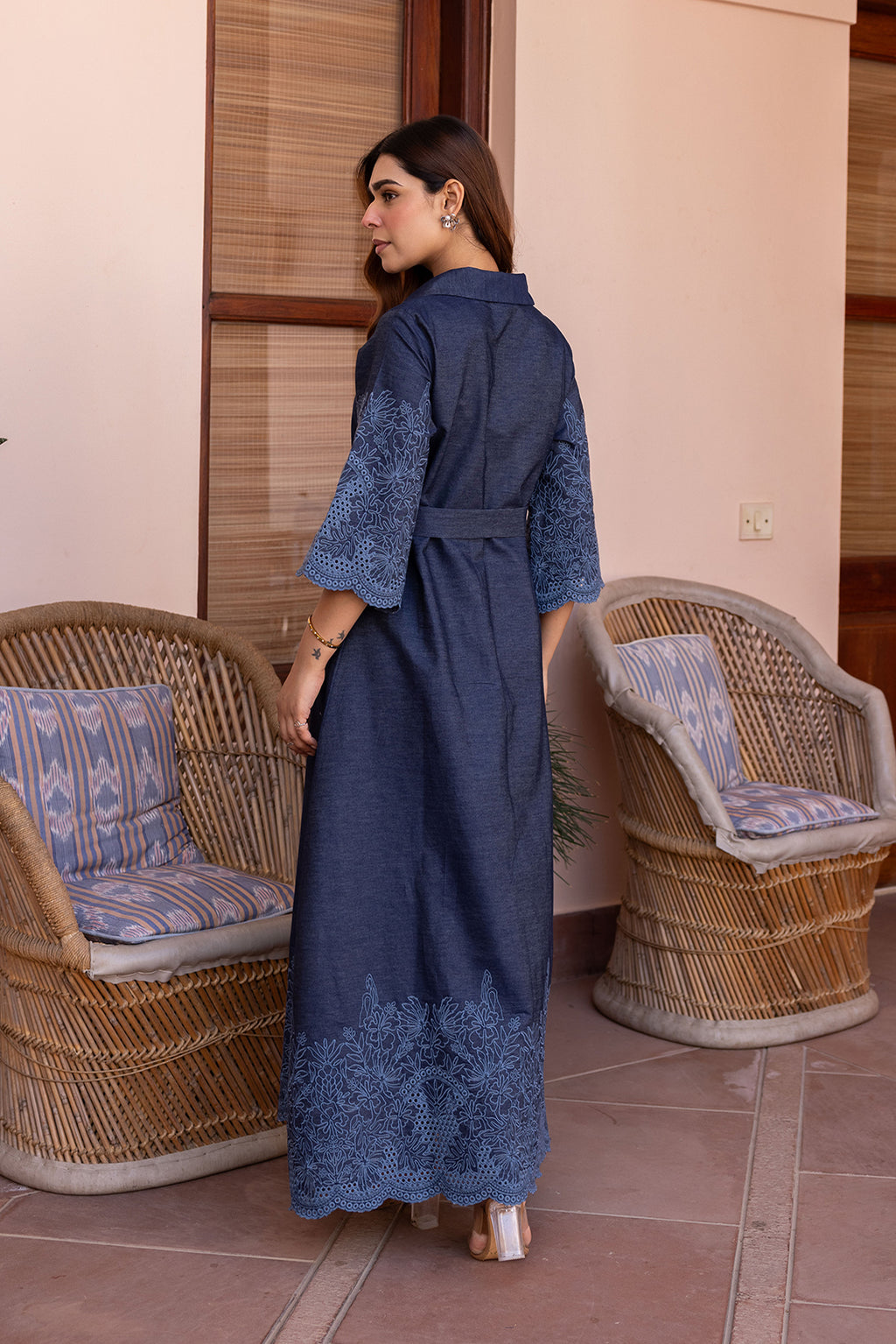 Experience a masterclass in impeccably polished denim with our Ziya Indigo Denim Cutwork Dress. This isn't just a casual staple; it’s a sophisticated take on luxury, featuring a crisp, structured indigo fabric that transitions seamlessly from a sun-drenched lunch to a moody dinner scene. The silhouette is defined by intricate tonal embroidery that winds along the flared bell sleeves and hem, culminating in a striking, hand-finished scalloped cutwork border that catches the light beautifully.