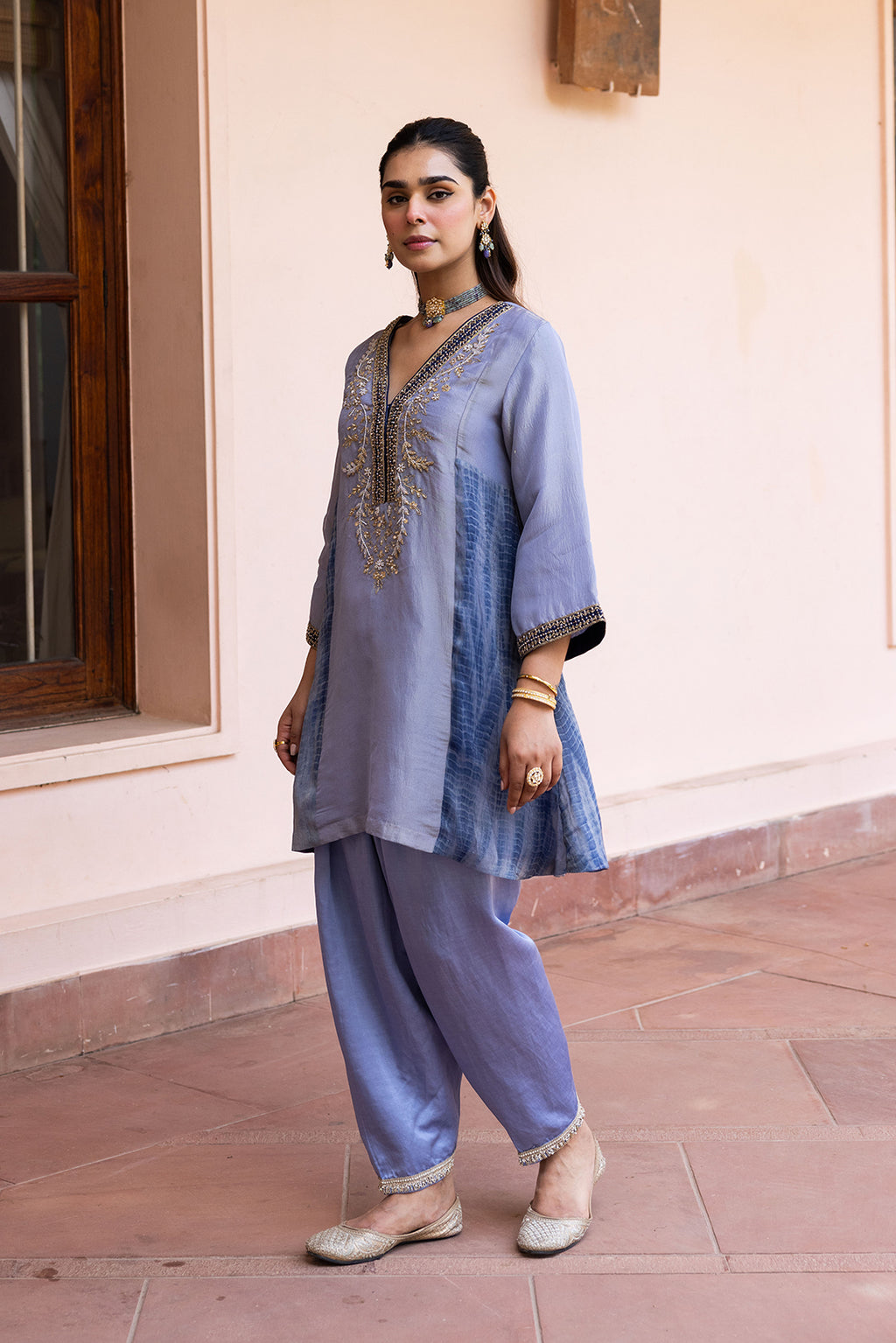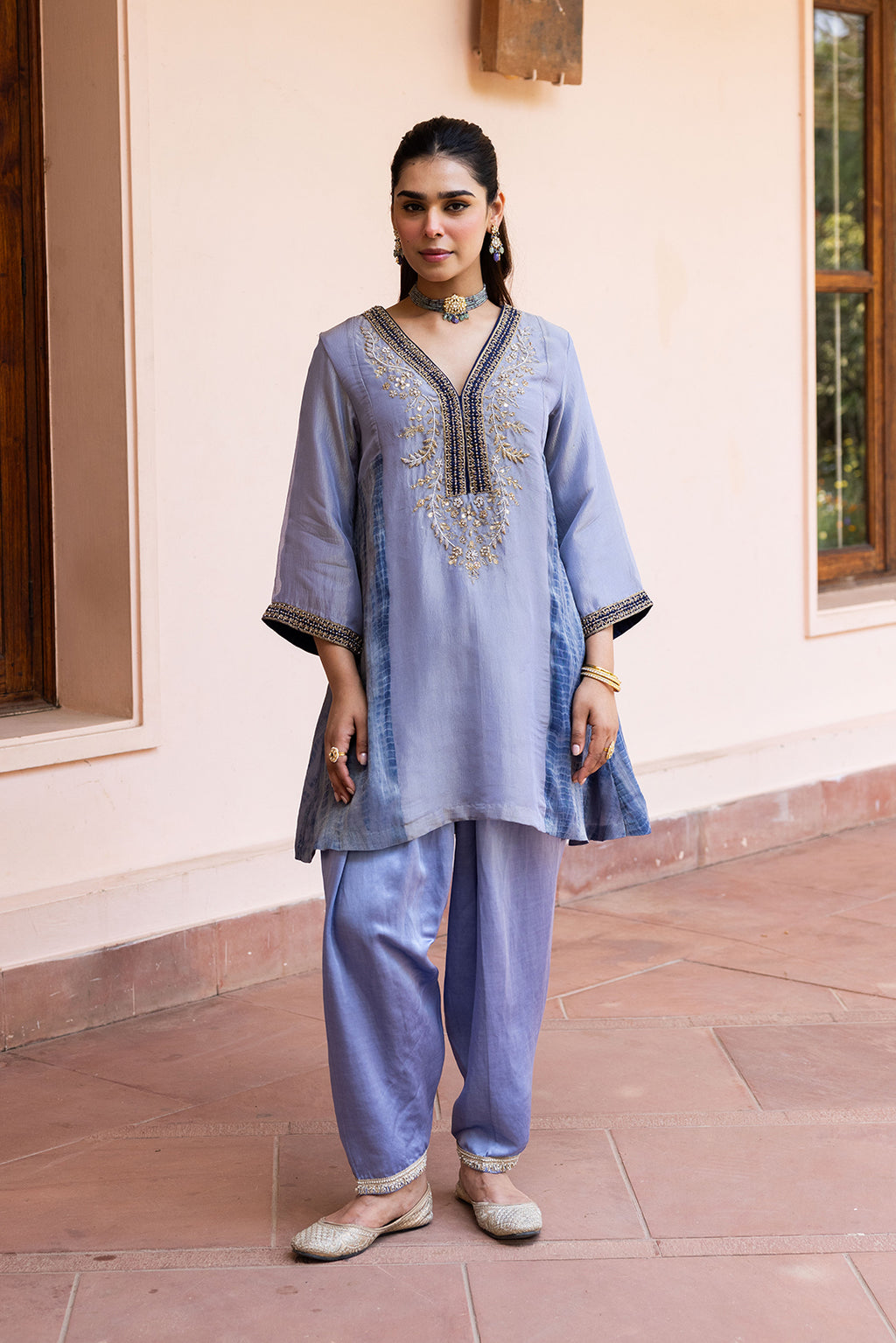The tunic is perfectly paired with coordinated Silk Salwar pants, adding a refined, structured edge to the ensemble. To complete the look, a rich, tonal Organza dupatta adds a final layer of heritage charm. Whether you are attending a grand wedding reception, a winter festive dinner, or an intimate Sufi night, this perfectly composed coordinate set ensures you look impeccably polished and effortlessly chic.