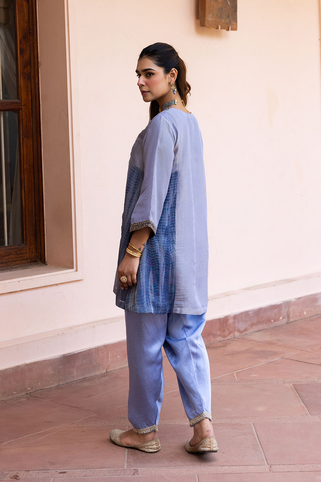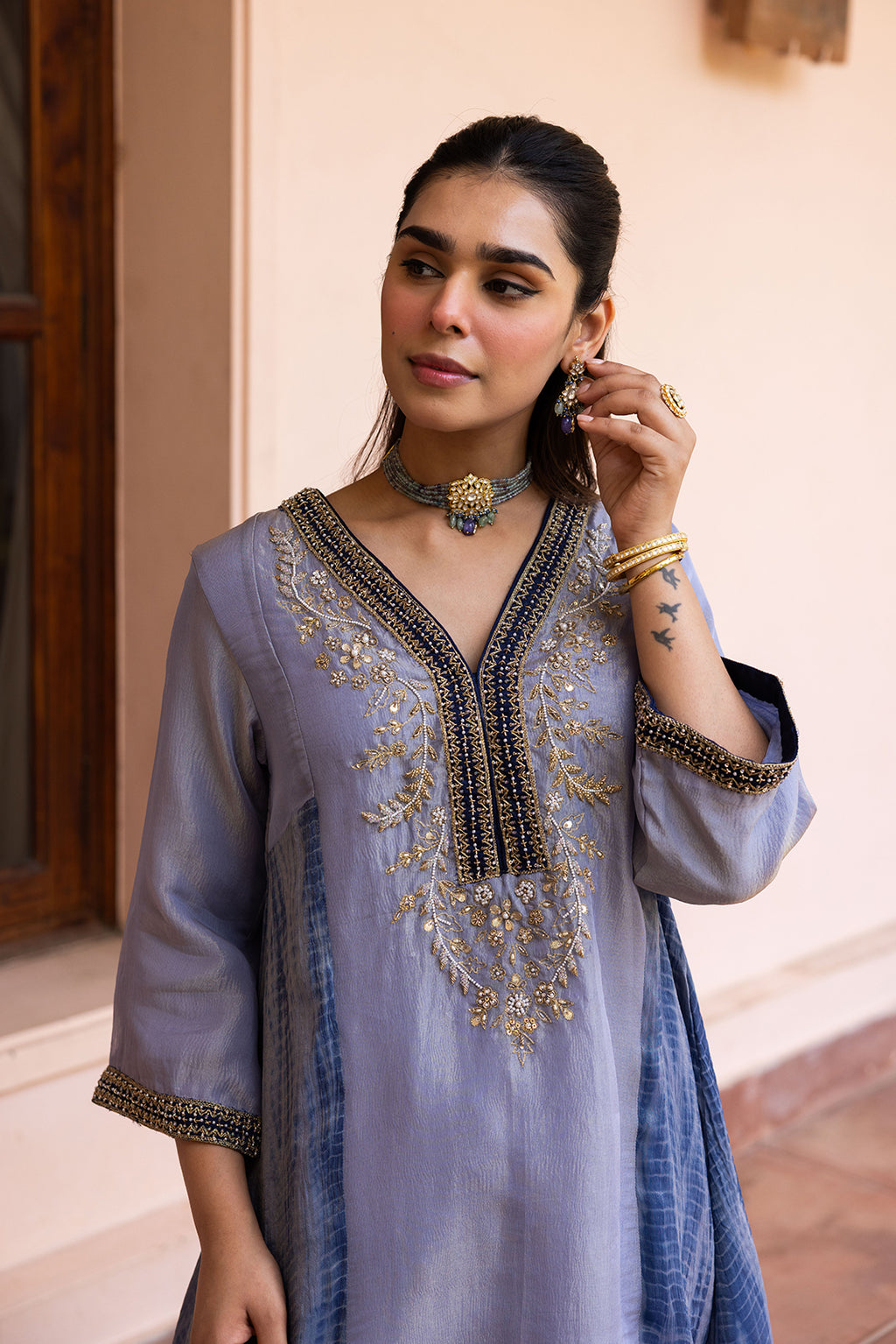 Radiate effortless luxury with the Ziya Icy Lilac Tissue Set. A masterclass in textile dimension, this luxe ethnic suit features a luminous tunic crafted from premium Gold-infused Tissue that gives off a sophisticated, multidimensional metallic glow.