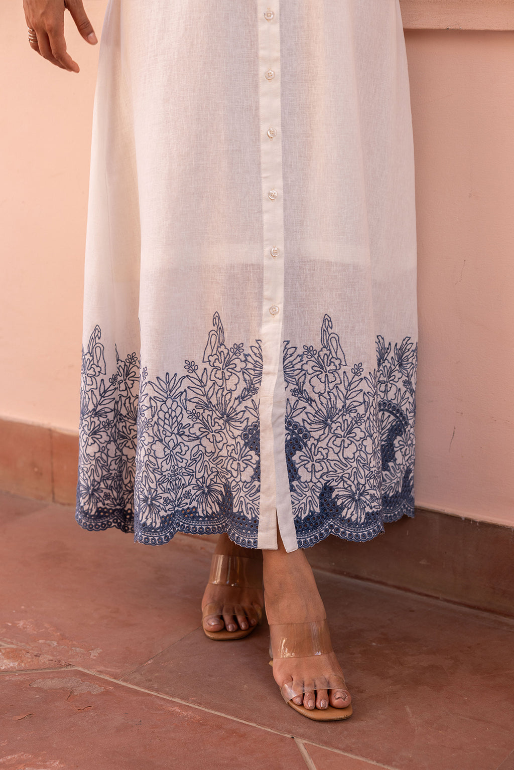 Capture the essence of coastal luxury with the Ziya Santorini Linen Cutwork Dress, a masterpiece of understated elegance. This breezy, full-length silhouette is crafted from premium, lightweight linen in a soft cream hue, designed to keep you cool and poised in any heat. The dress is strikingly contrasted with an intricate slate-blue embroidery that adorns the dramatic bell sleeves and hemline, finished with our signature scalloped cutwork for a touch of artisanal sophistication.